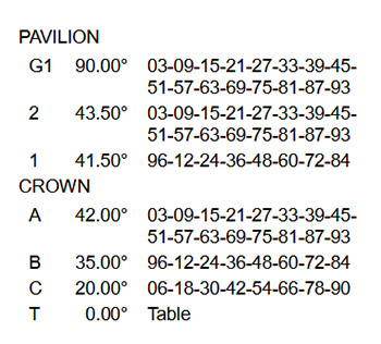 Si je traduis cette ligne en français: le numéro 1 indique les facettes correspondantes sur le plan de taille. Elles devront être taillées avec un angle de 41.5° aux indices suivants sur la roue indexée : 96-12-24-36 etc.